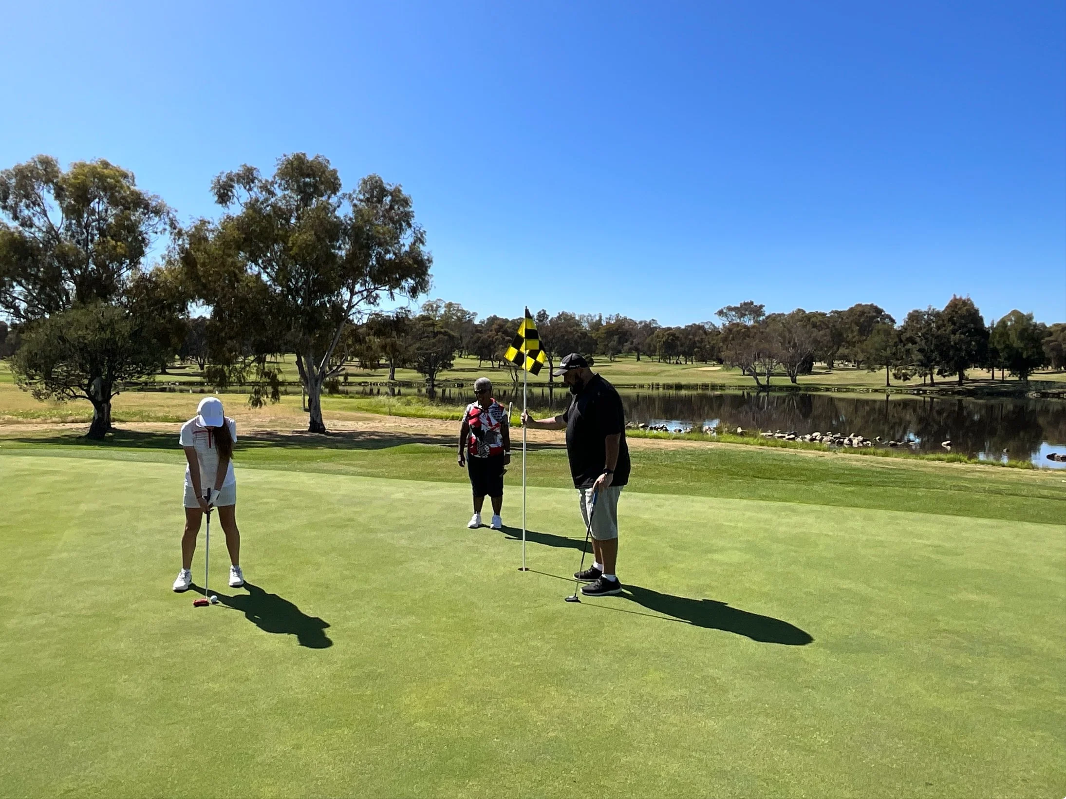 Three generations enjoying golf together at Murrumbidgee Country Club’s Green Course, developed as a values-based project under what became the Regional Golf Development Initiative, demonstrating how strategic tee placement creates accessible experiences for players of all ages and abilities.