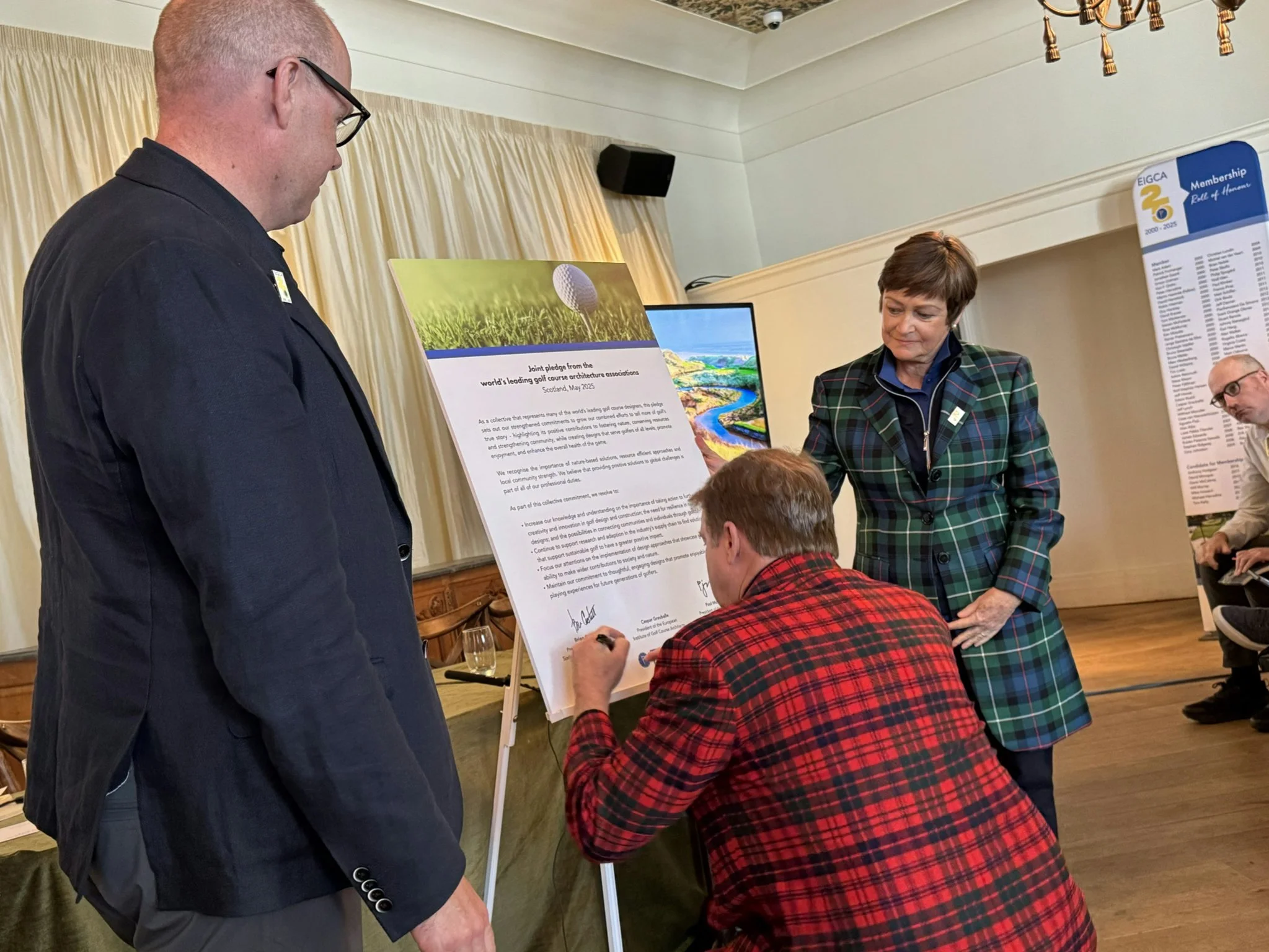 EIGCA President Caspar Grauballe, ASGCA President Brian Costello, and SAGCA representative Lyne Morrison at the historic pledge signing ceremony in Scotland, May 2025 - marking a milestone in global golf course architecture collaboration.
