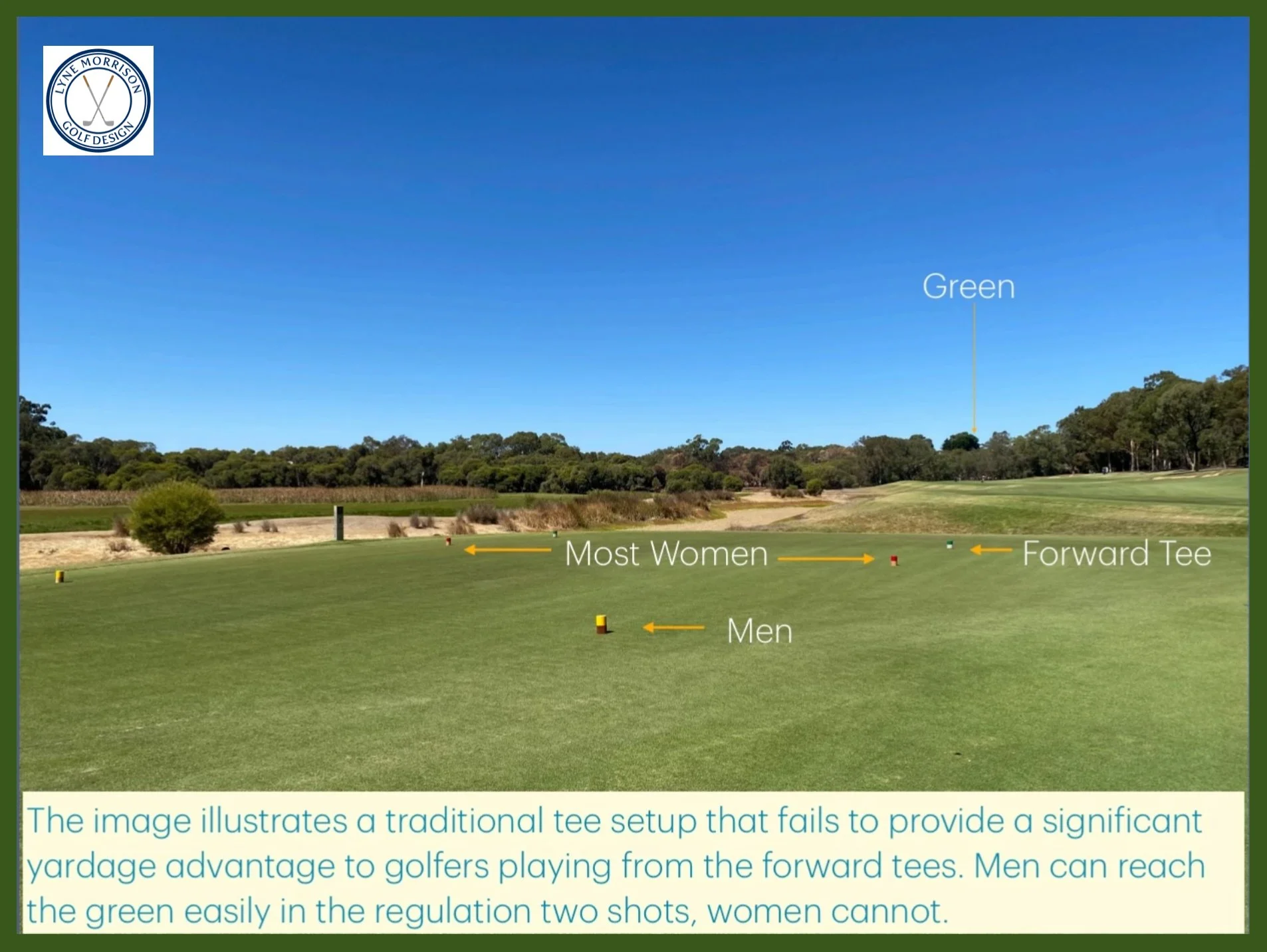 The reality is that many forward tee users have become accustomed to a version of golf that is more difficult and less varied than what the average male golfer experiences. Recreational female golfers drive in the range of 135-145 metres compared to recreational males at 170-220 metres, with senior women averaging 105-115 metres and longer-hitting women 155-175 metres. Yet many courses still fail to provide tees positioned to allow women golfers to reach greens in regulation figures.