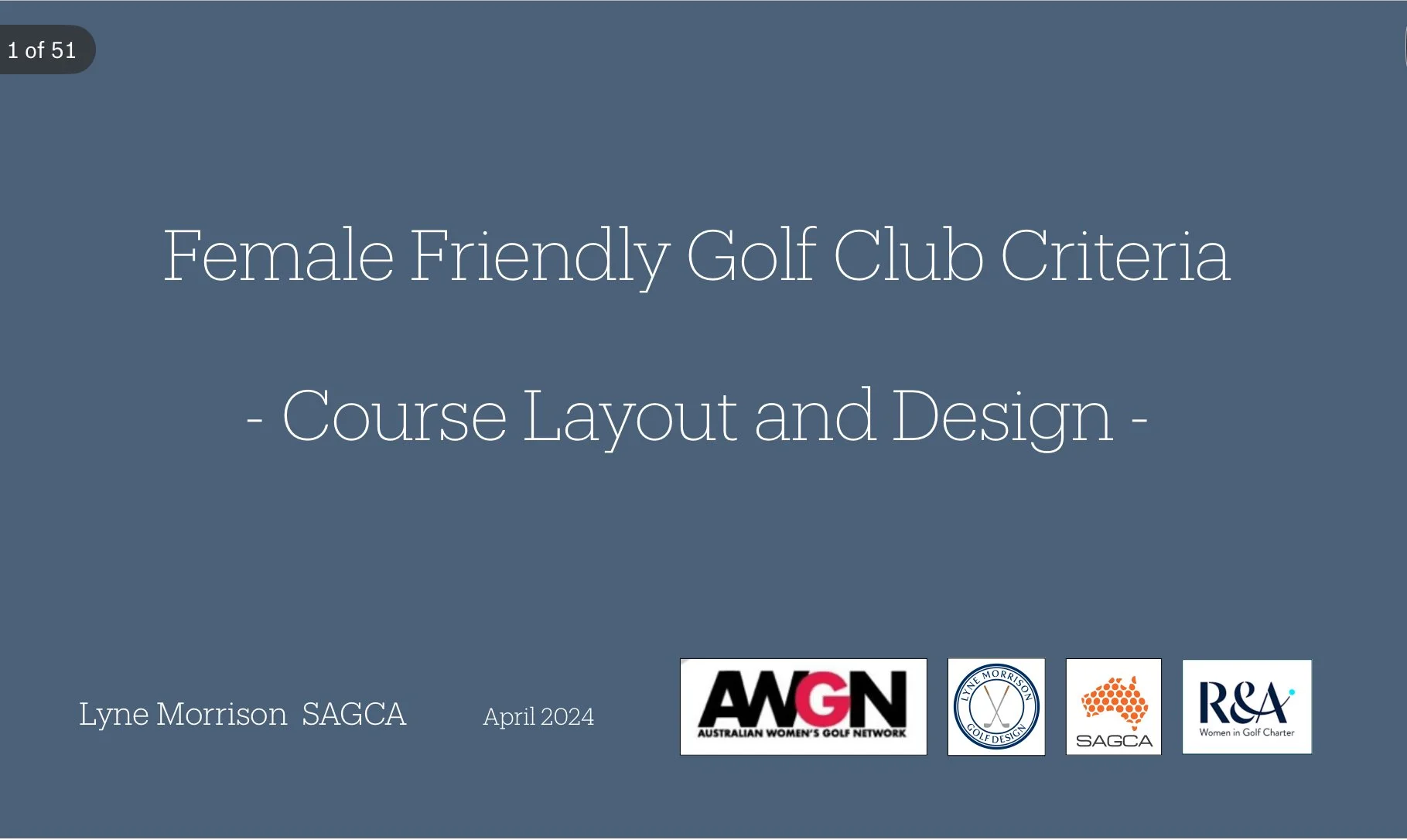 Female Friendly Golf Club Criteria presentation developed for the Australian Women’s Golf Network, outlining evidence-based course layout and design principles that create welcoming environments for women golfers. This comprehensive framework supports clubs in implementing inclusive design strategies that enhance participation and member satisfaction.