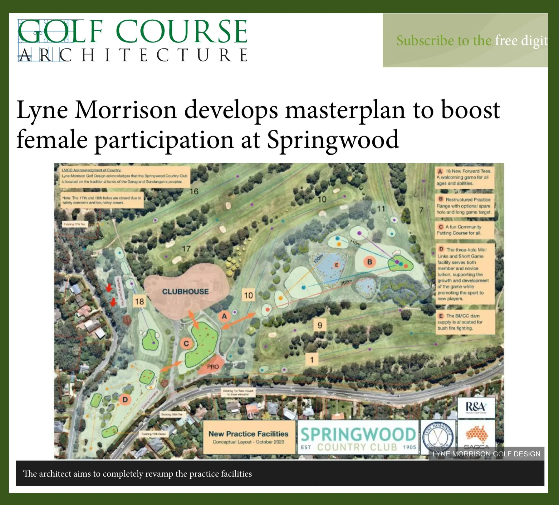 Featured in Golf Course Architecture magazine for the Springwood Country Club masterplan - developing comprehensive facilities to boost female participation and community engagement.